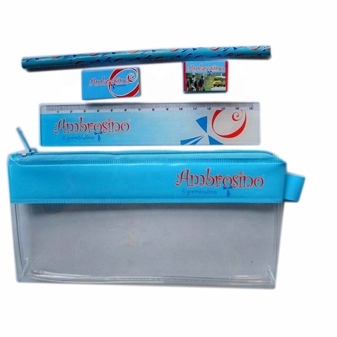 קידום מכירות מותאם אישית לוגו מכתבים סט עם עיפרון, שליט, מחק ומחדד לתוך PVC תיק